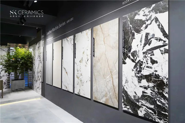 展位還有首發亮相的—SK皮革大理石系列,皮革與大理石的藝術跨界融合,原創大理石紋理,以全新數碼釉工藝,數碼模具+精雕+刷拋,讓磚面呈現皮革的獨特觸感,不拘一格,風潮引領,時尚出圈。
