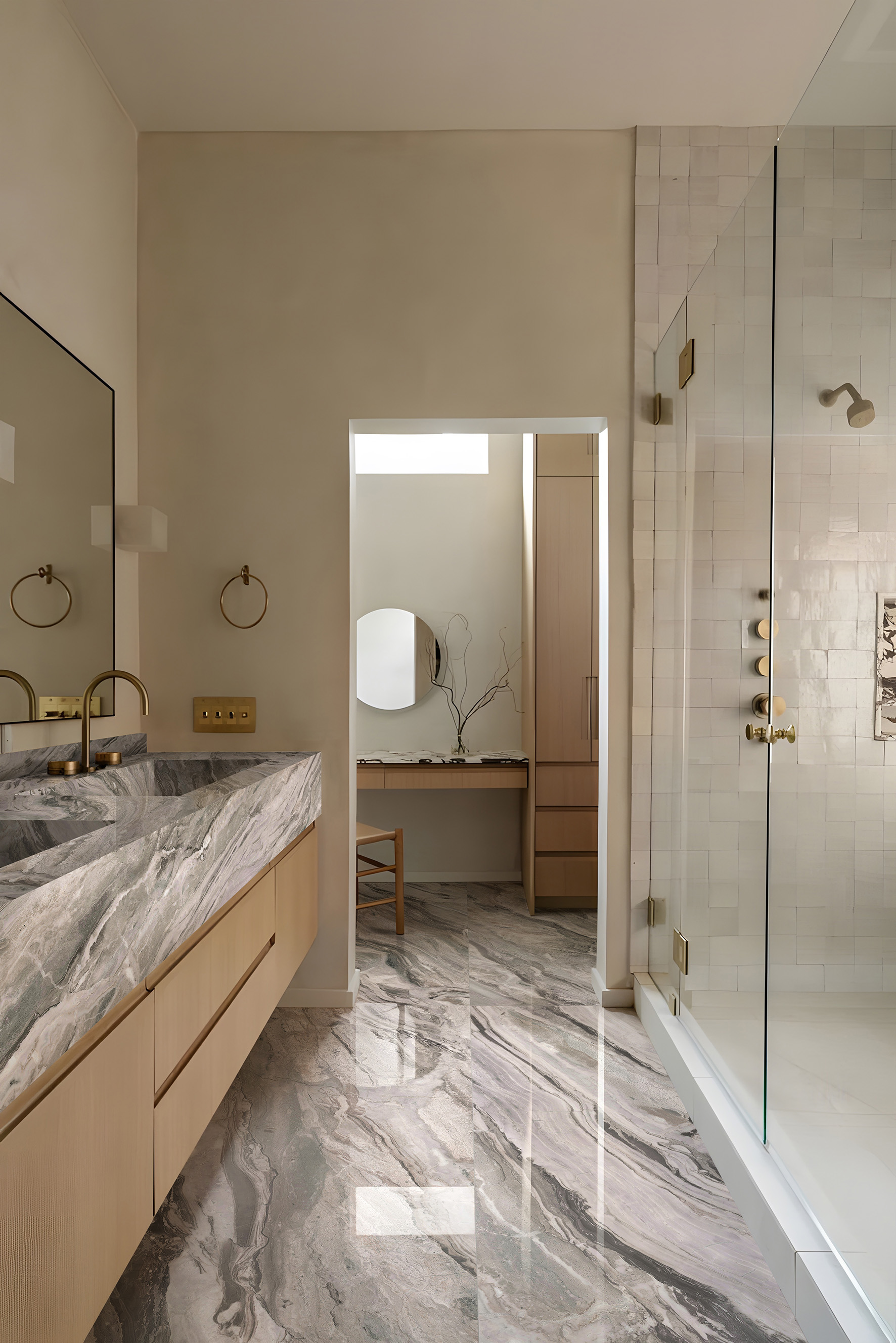 冷靜的灰階基底,流暢的天然紋理如水墨暈染,奢華彩晶干粒在巖板表面流淌,打造微米級(jí)別的奢華美學(xué)。
