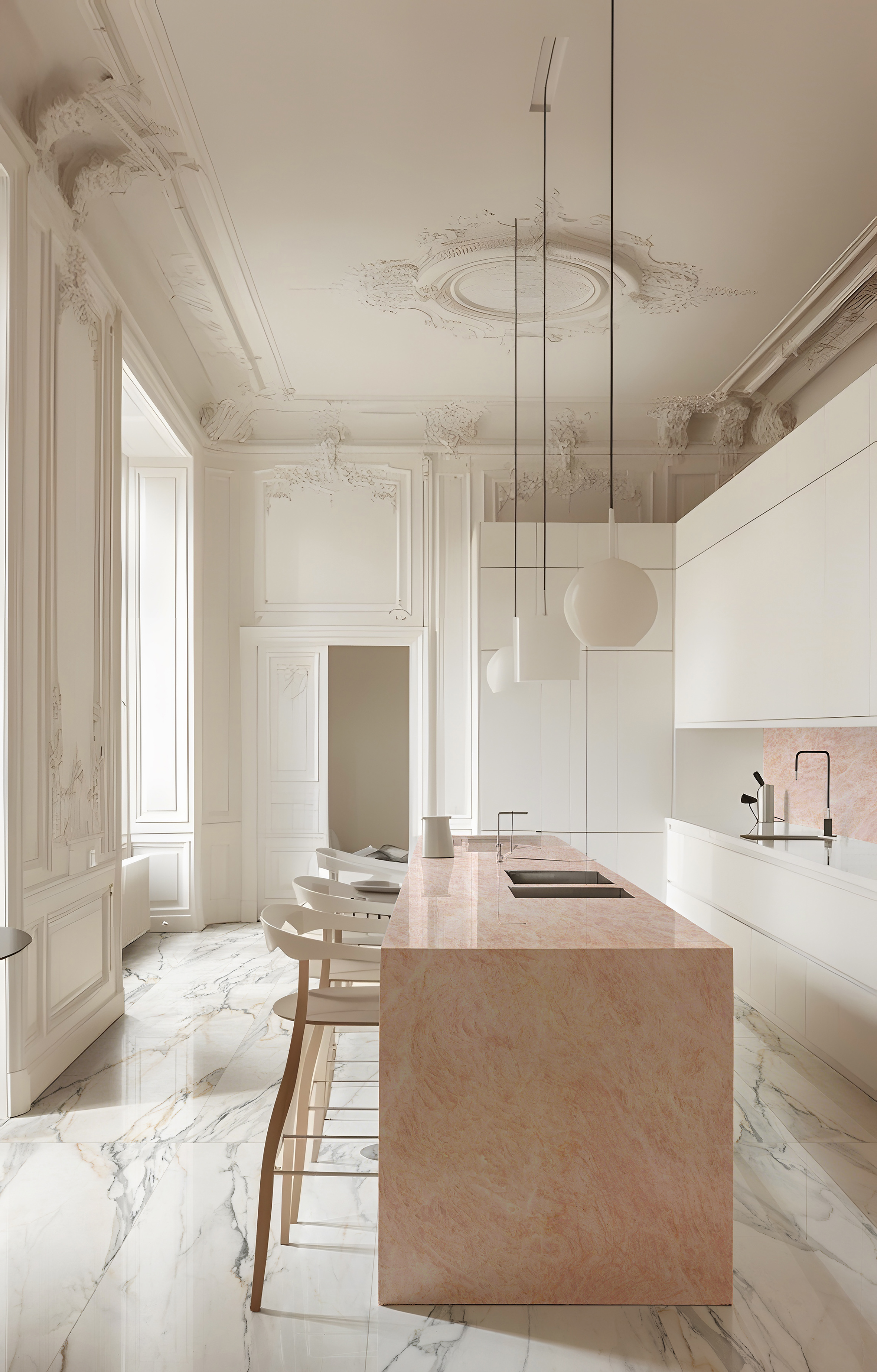 充滿秩序與韻律的長(zhǎng)廊,伴隨著和諧的色彩,大花白的動(dòng)靜交織與金屬色的巧妙裝飾,令空間雅致而富有生機(jī)。